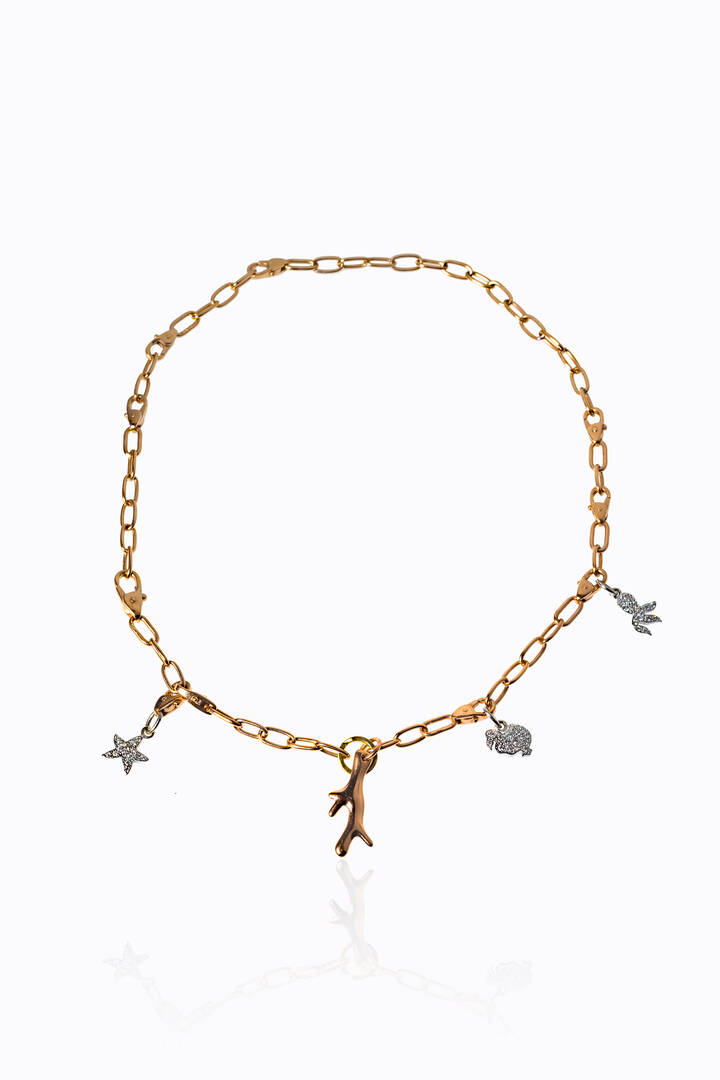 Peso gr 18 Lotto di due bracciali non firmati in oro rosa 9 Kt di cui uno con charms Pomellato linea Dodo raffiguranti un ramo di corallo (oro 9 Kt) un dodo una stella e un polipo in oro bianco 18 K con diamanti taglio brillante I due bracciali si possono unire e formare un girocollo (Lunghezza cm 37)