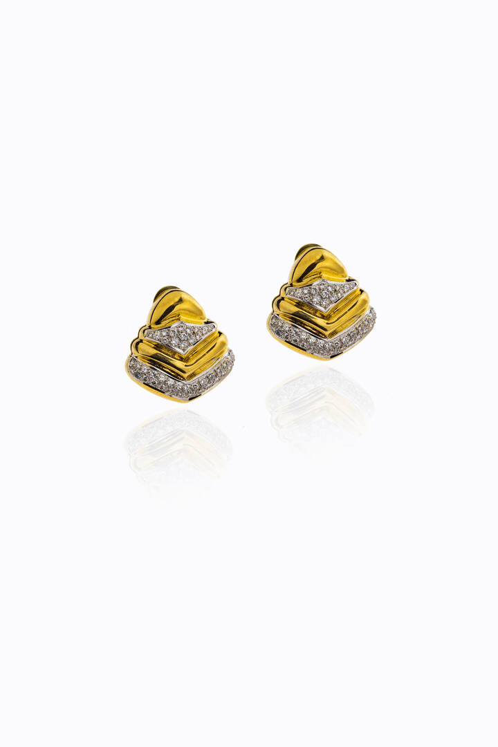Peso gr 19 7 in oro giallo e bianco a lobo a forma di triangoli bombati e lavorati con diamanti taglio brillante per totali ct 0 80 ca