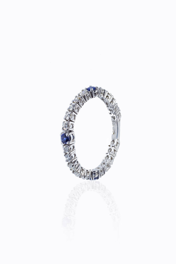 Peso gr 2 4 Misura 16 (56) semirigida in oro bianco con diamanti taglio brillante per totali ct 0 80 ca e tre zaffiri taglio rotondo