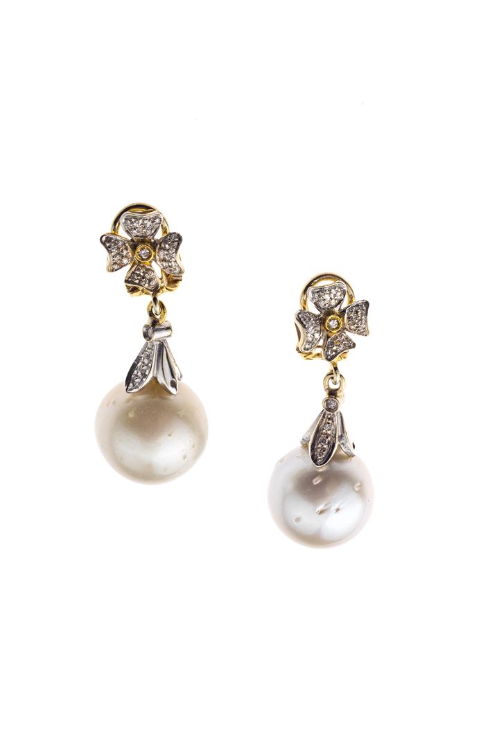 Peso gr 20 2 in oro giallo e bianco con fiori ai lobi e corpo in diamanti taglio brillante per totali ct 0 20 ca terminanti con due perle australiane del diam di mm 16 2 ca