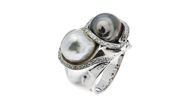 NAVARRINI : Peso gr 21 Misura 13 Anello in oro bianco  firmato Navarrini  con perla australiana scaramazza e perla Tahiti scaramazza. Diamanti taglio brillante a decoro per totali ct 0 20 ca  - Asta Gioielli - Associazione Nazionale - Case d'Asta italiane