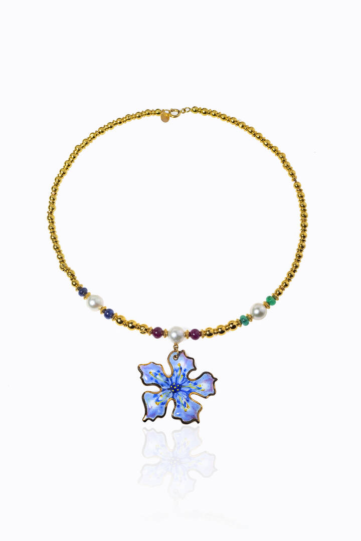 Peso gr 22 Girocollo rigido firmato Gabriella Rivalta con sfere (ammaccature) in oro giallo; tre perle giapponesi al centro con dischi di rubini e smeraldi. Un ciondolo pendente a forma di fiore interamente smaltato