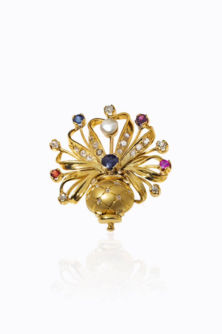 Peso gr 25 4 cm 5x4 in oro giallo a cestino con perlina centrale; diamanti taglio brillante di vecchio taglio e rosette per totali ct 1 0ca zaffiri e rubini per totali ct 1 50 ca e gemme sintetiche