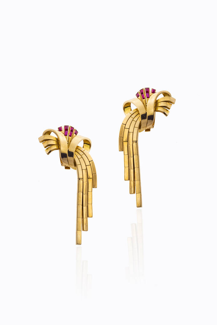 Peso gr 26 8 in oro rosa anni '40 a clip con volute terminanti con frange. Rubini [..]