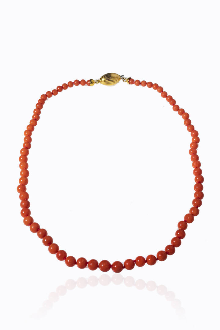 Peso gr 28 6 Lunghezza cm 50 composto da un filo di sfere di corallo rosso mediterraneo a scalare del diam. di mm 5 a 7 5. Chiusura in oro a barilotto fesonato Accompagnato da certificato telematico di autenticità Ce.S.Ar. Centro Studi Archeometrici.