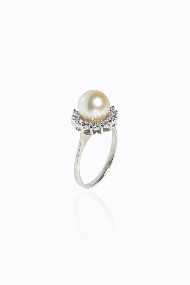 Peso gr 3 5 Misura 11 (51) in oro bianco con perla giapponese centrale del diam. di mm 8 e contorno pietre sintetiche