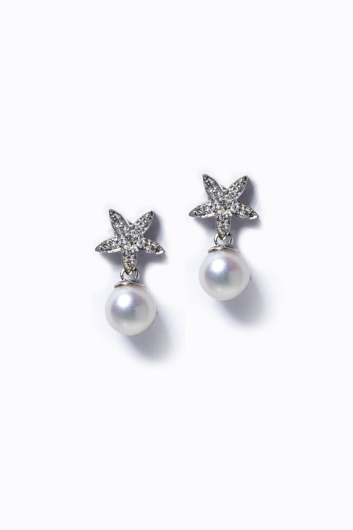 Peso gr 3 6 in oro bianco con stelle ai lobi in diamanti taglio brillante per totali ct 0 16 ca probabile colore G-H purezza IF-VVS e due perle giapponesi del diam di mm 5 pendenti