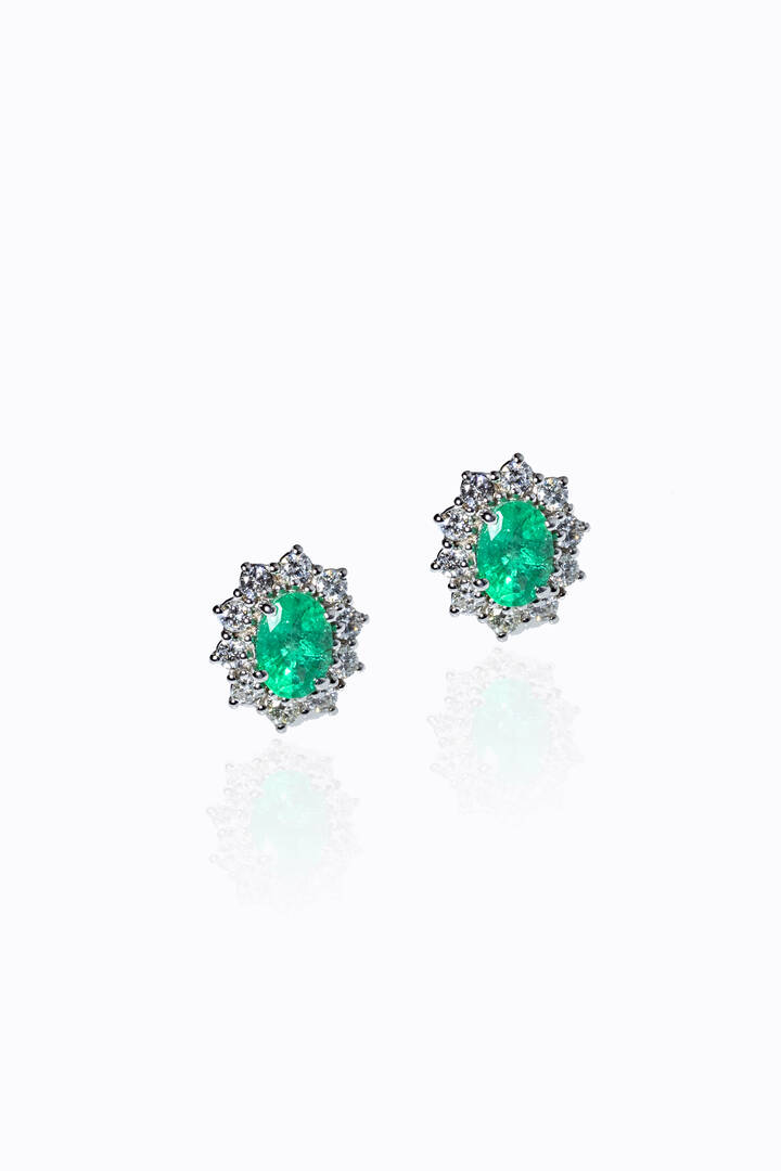 Peso gr 3 9 in oro bianco a lobo a firma di margherita con al centro due smeraldi taglio ovale per totali ct 1 37 ca contornati da diamanti taglio brillante per totali ct 0 67 ca probabile colore G-H purezza IF-VVS