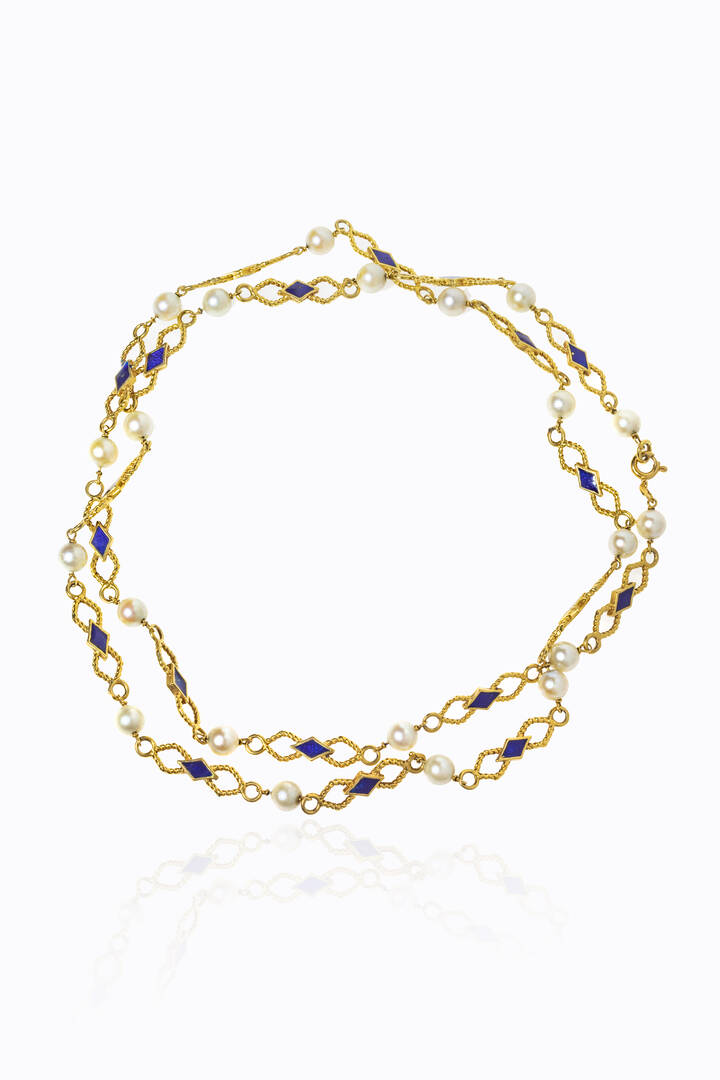 Peso gr 30 8 Lunghezza cm 70 in oro giallo a maglia romboidale lavorata a corda con elementi in smalto blu alternati a perle giapponesi del diam. di mm 6 ca.