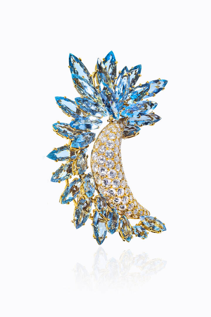 Faraone : Peso gr 33 8 Cm 6X3 Grande spilla in oro giallo  firmata Faraone  di forma fantasia con diamanti taglio brillante per totali ct 4 50 ca e acquamarine taglio navette per totali ct 35 ca  - Asta Gioielli - Associazione Nazionale - Case d'Asta italiane