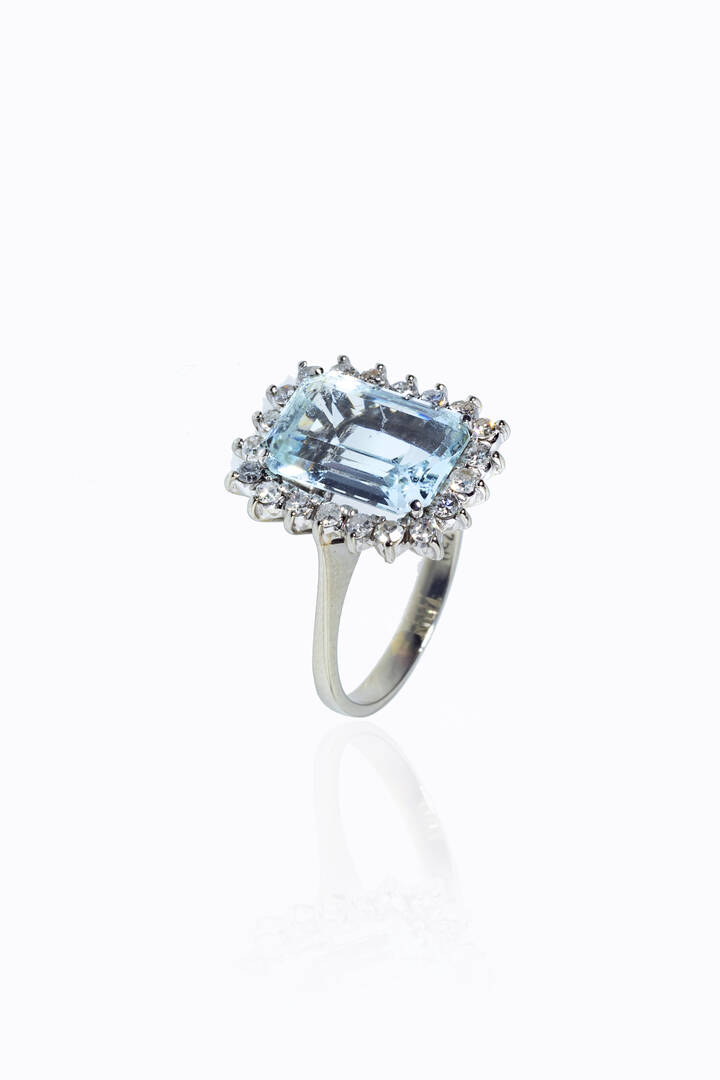 Peso gr 4 4 Misura 10 (50) in oro bianco al centro acquamarina taglio ottagonale a gradini di ct 2 50 ca e contorno di diamanti taglio 8/8per totali ct 0 20 ca