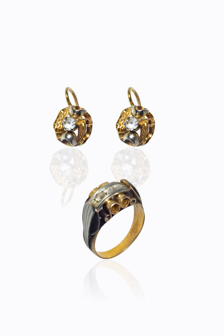 Peso gr 4 6 e 4 1 Misura 13 in oro giallo e bianco composta da coppia di orecchini a monachella ed anello con pietre sintetiche