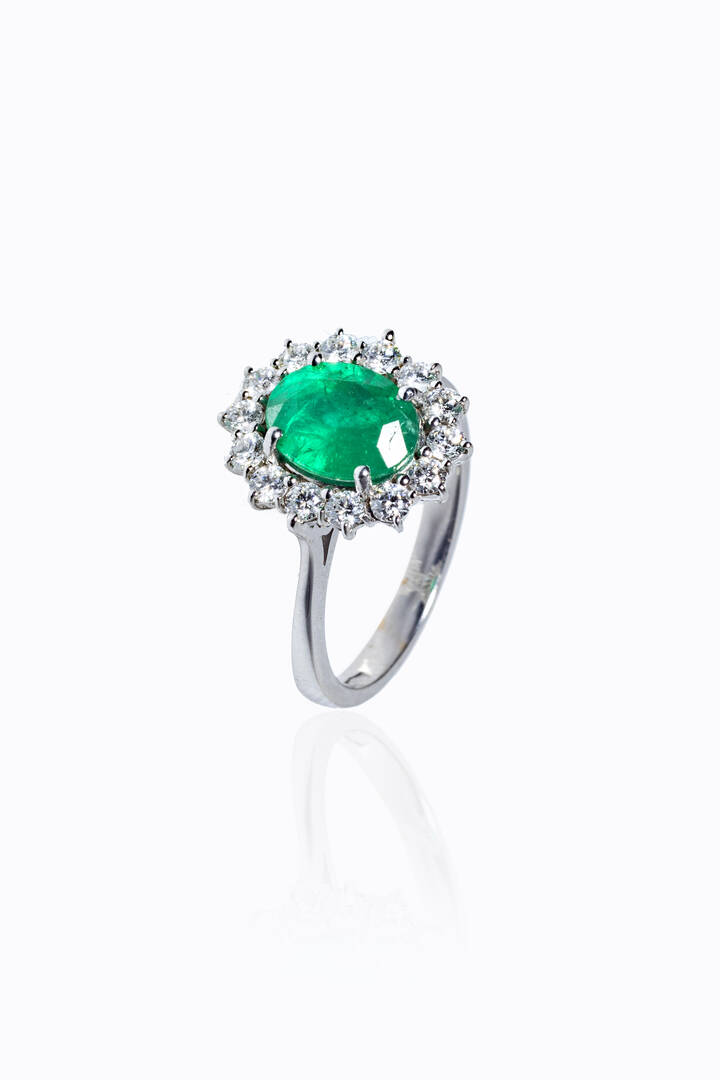 Peso gr 4 7 Misura 14 (54) in oro bianco sommità a margherita con al centro smeraldo tagli ovale di ct 1 76 ca contornato da diamanti taglio brillante per totali ct 0 60 ca probabile colore G-H purezza IF-VVS