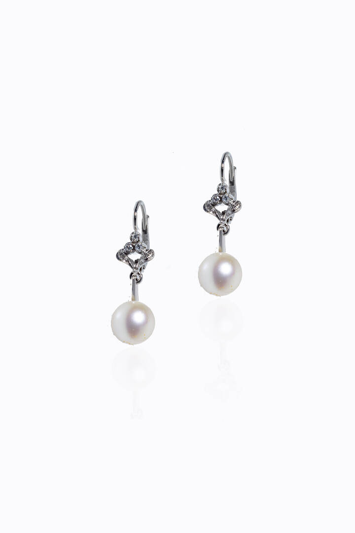 Peso gr 4 8 in oro bianco a monachella con due perle giapponesi del diam. di mm 8 2 ca pendenti e diamanti taglio 8/8 per totali ct 0 05 ca
