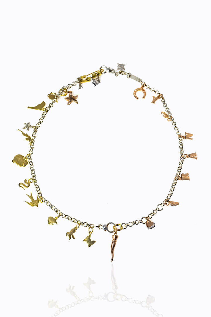 Peso gr 50 2 Lunghezza cm 45 Girocollo in argento composto da due bracciali modificati della linea Dodo con 9 charms linea Dodo in oro 9 Kt raffiguranti un corno portafortuna un cuoricino con diamanti taglio brillante una stella con diamanti un ferro di cavallo sei lettere dell'alfabeto (F-R-A-N-C-Y); una rana con diamanti taglio brillante; una stellina con diamanti taglio brillante; nove Dodo in oro giallo 18 Kt raffiguranti un granchio un cavalluccio marino un dodo un delfino un serpente una rondine un pesce un polipo e una farfalla. Al centro spilla da balia in oro giallo non firmata recante tre grani e tre lettere delle linea Dodo con diamanti (F-r-a)