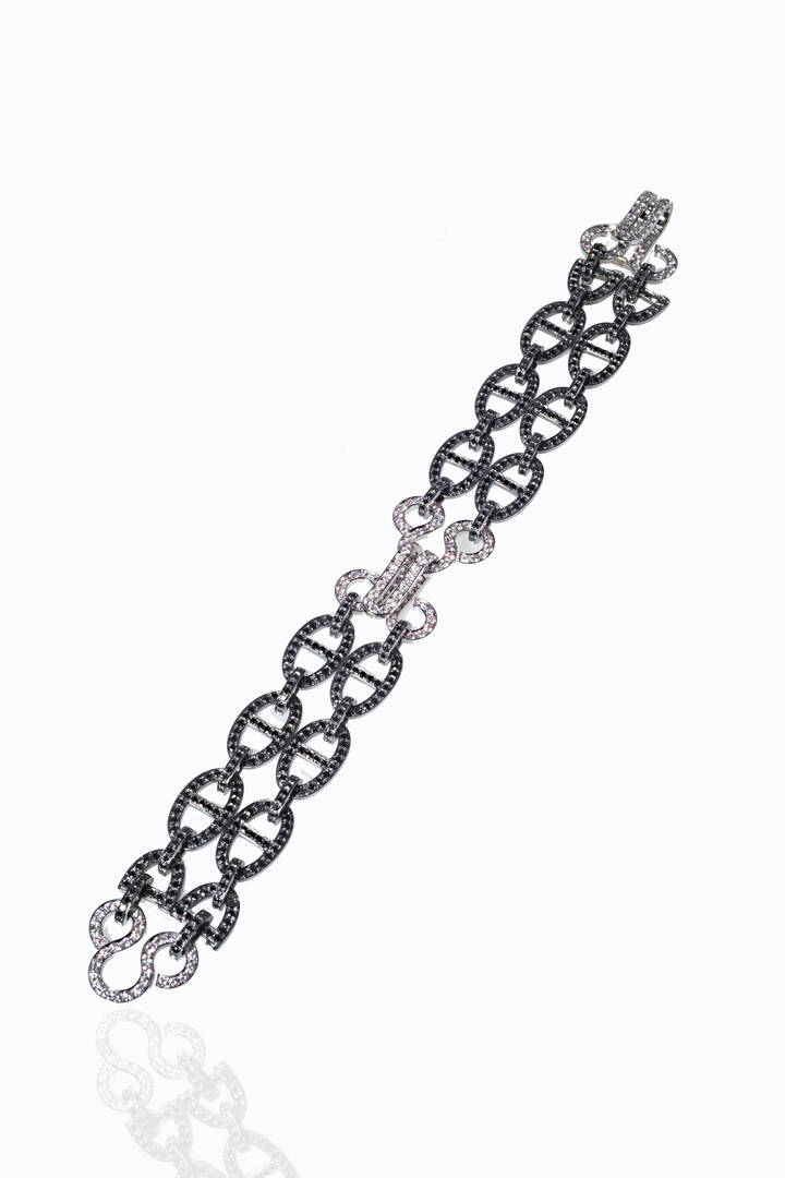 Peso gr 52 8 Lunghezza cm 20 in oro bianco e brunito composto da due file di segmenti rigidi ovali e rotondi interamente in diamanti neri e bianchi per totali ct 9 75 ca probabile colore G-H purezza IF-VVS (bianchi)
