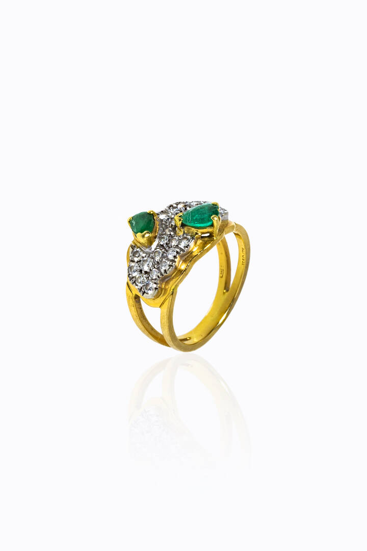 Peso gr 6 0 Misura 11 (51) Anello in oro giallo firmato Repossi con due smeraldi (sbeccature) taglio a goccia e diamanti tagli brillante per totali ct 0 60 ca