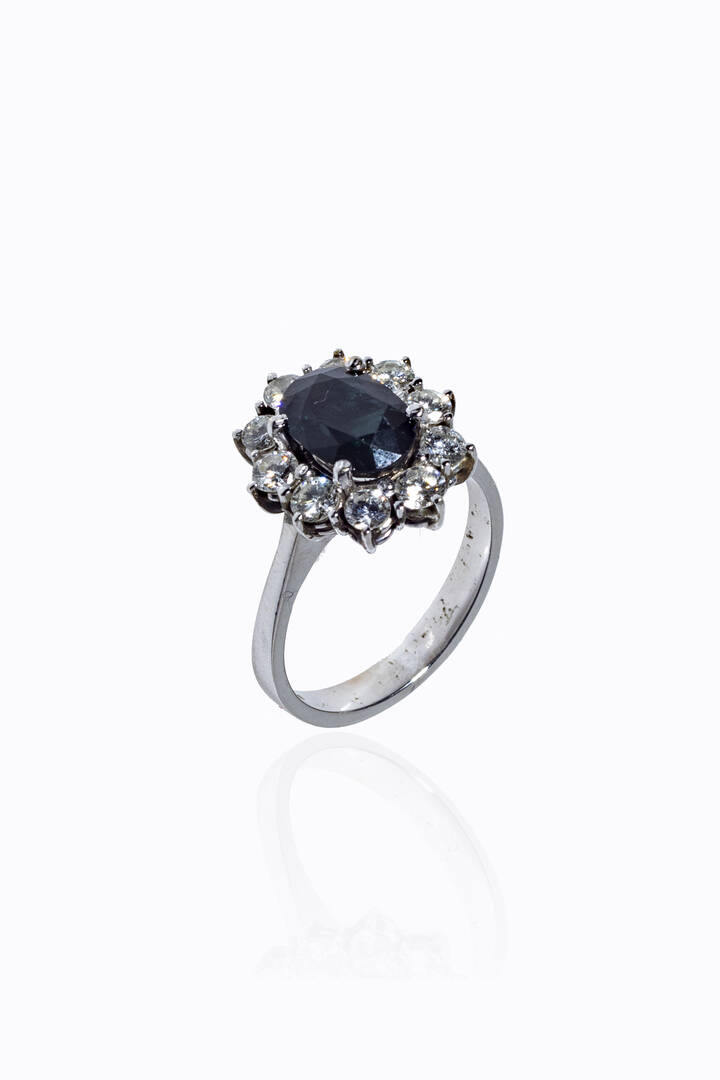 Peso gr 6 2 Misura 15 (55) in oro bianco a margherita al centro zaffiro taglio ovale di ct 2 0 ca e contorno di diamanti taglio brillante per totali ct 0 70 ca