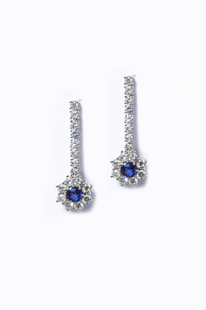 Peso gr 6 4 in oro bianco pendenti con diamanti taglio brillante per totali ct 3 20 ca probabile colore G-H purezza IF-VVS terminanti con due fiori con due zaffiri taglio rotondo per totali ct 1 40 ca