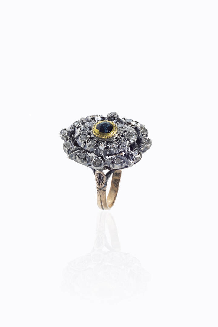 Peso gr 6 5 Misura 15 (55) in oro giallo a bassa caratura ed argento sommità ovale con al centro zaffiro e rosette di diamanti per totali ct 0 40 ca