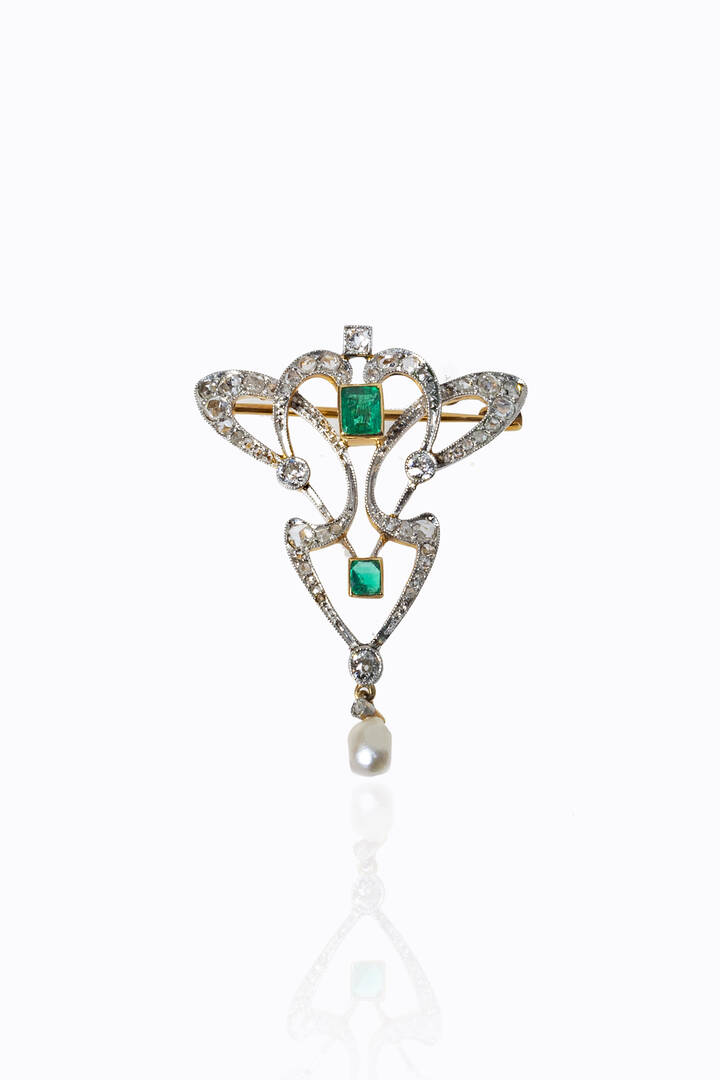 Peso gr 6 6 Cm 5x3 in oro giallo a bassa caratura ed argento a voluta inizi XX secolo con smeraldi taglio baguette per totali ct 0 50 ca e diamanti taglio brillante di vecchio e rosette per totali ct 0 85 ca. Una perlina pendente