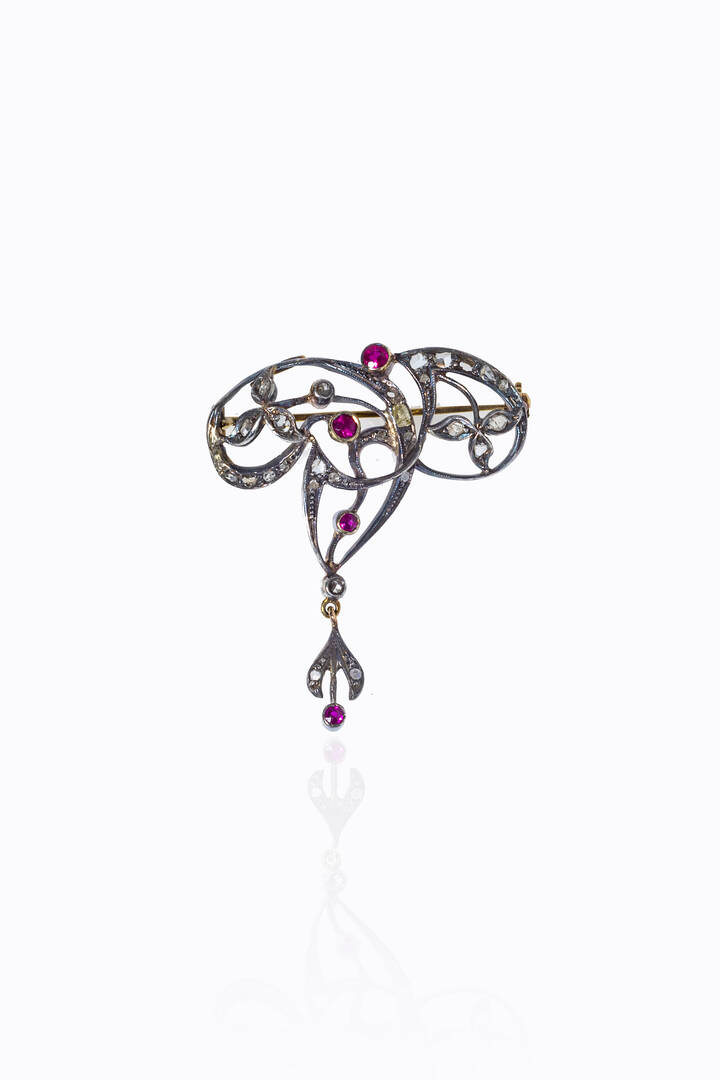Peso gr 7 1 Cm 4x4 in oro giallo a bassa caratura ed argento XIX secolo con rosette (due mancanti) per totali ct 0 30 ca e rubini