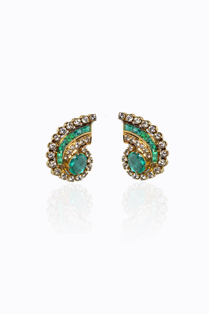 Peso gr 7 3 in oro giallo a volute con smeraldi taglio ovale e baguette per totali ct 3 0 e diamanti tagli brillante per totali ct 1 40 ca