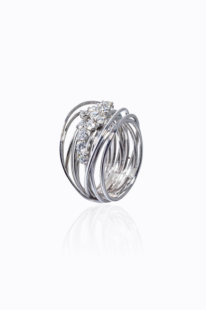 Peso gr 8 9 Misura 13 (53) in oro bianco sommità a fili intrecciati trattenenti al centro diamanti taglio brillante per totali ct 0 61 ca probabile colore G-H purezza IF-VVS