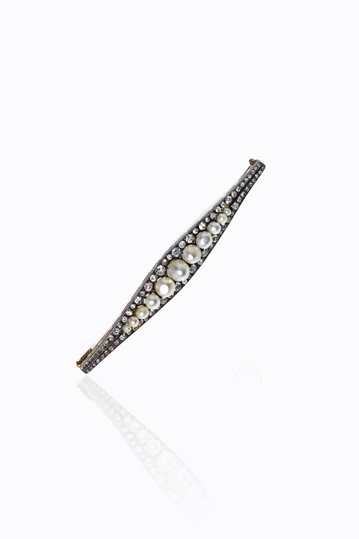 Peso gr 9 2 Lunghezza cm 8 in oro a bassa caratura ed argento a barretta XIX secolo con perle centrali e diamanti di vecchio taglio per totali ct 1 50 ca