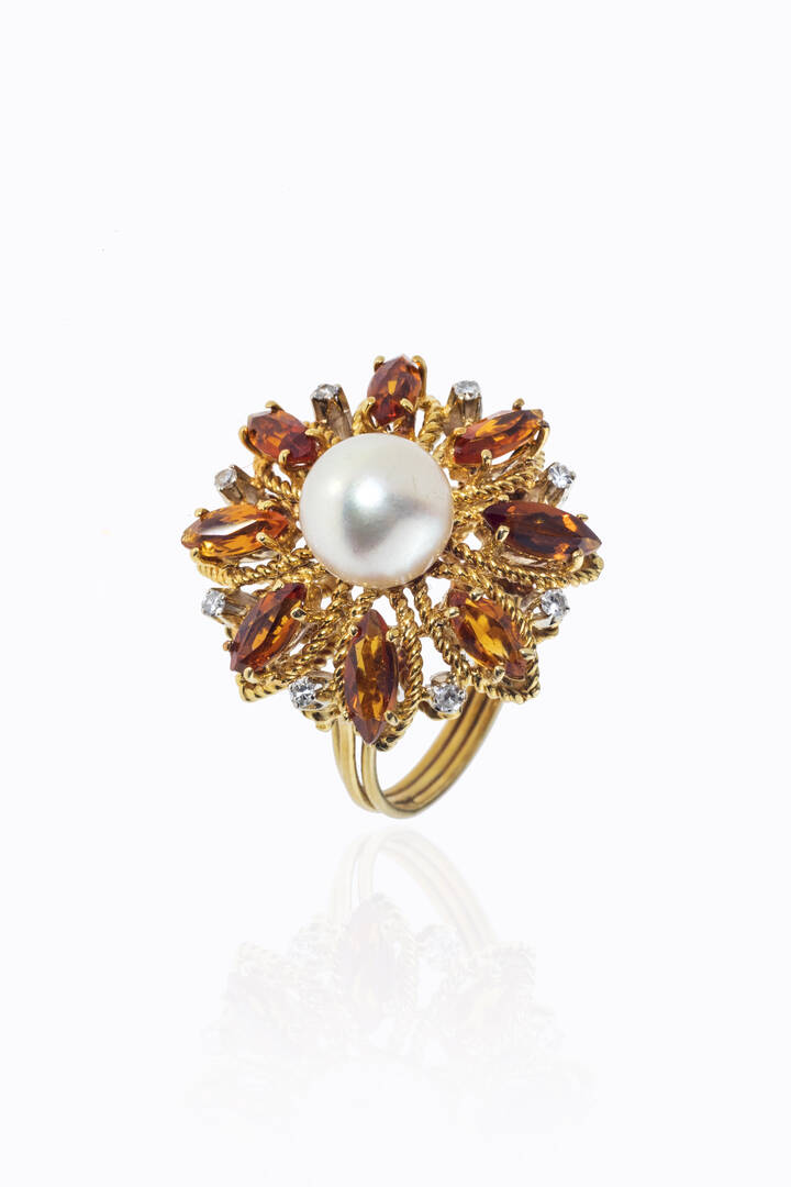 Peso gr 9 7 Misura 16 (56) in oro giallo sommità rotonda con perla giapponese centrale del diam. di mm 8 5; quarzi citrini taglio navette sintetici e diamanti taglio 8/8 per totali ct 0 10 ca