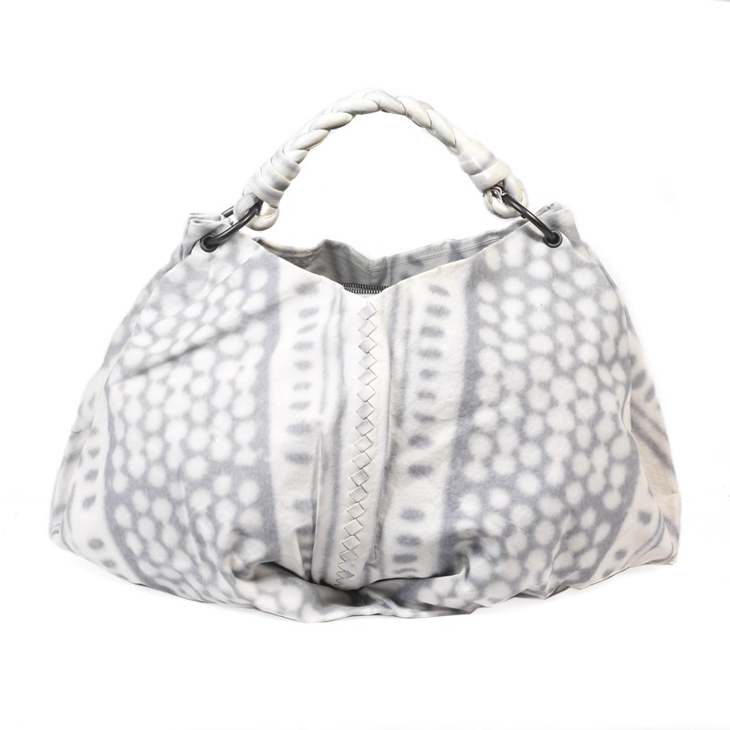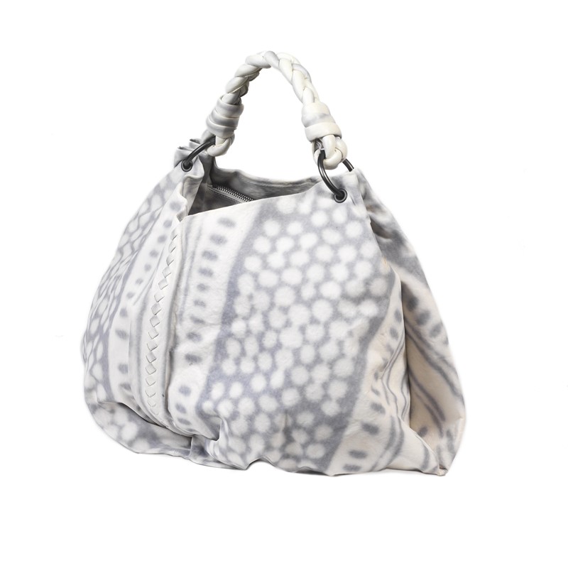 BOTTEGA VENETA BORSA FORTUNE COOKIE Particolarissimo intreccio bicolore, bianco e grigio con manico per stare anche a spalla in pelle intrecciata. Questa grande borsa morbida e capiente a forma di hobo ha accessori in ottone invecchiato. Dim. cm 54x26x29