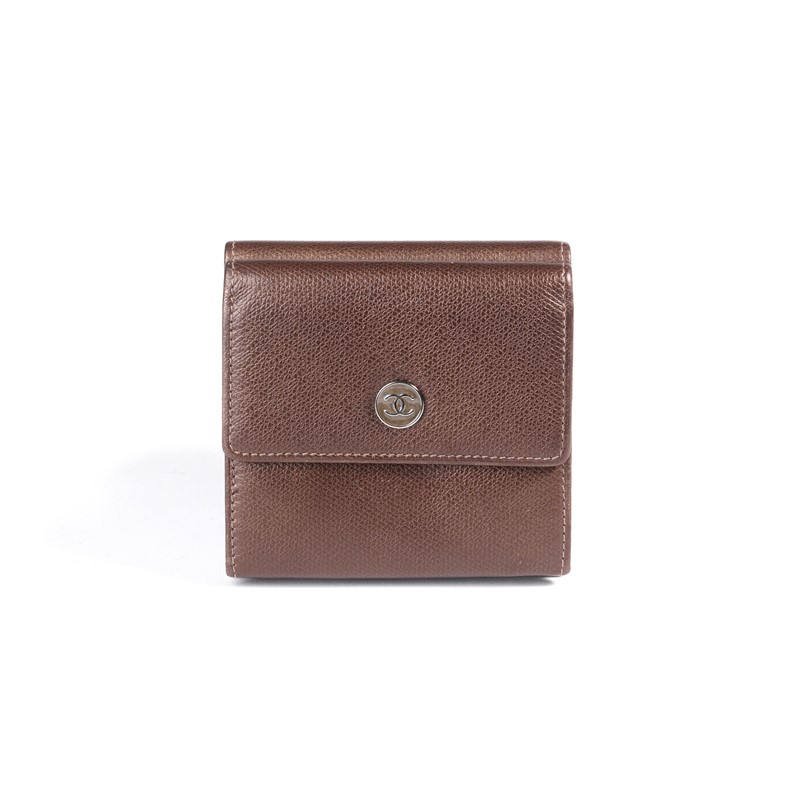In una raffinata pelle granulata marrone con bottone con logo CC color argento lucido, in una forma compatta, adatto anche alle borse più piccole.