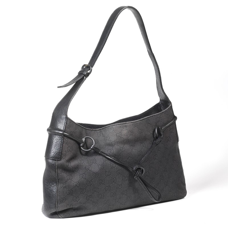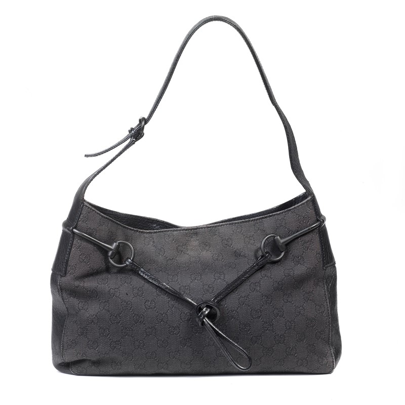 Con l‘attualissima forma a Hobo, in tessuto denim nero GG all over e metalleria argento, incluso l’iconico Horsebit; dettagli di rifinitura in pelle nera come il manico.
