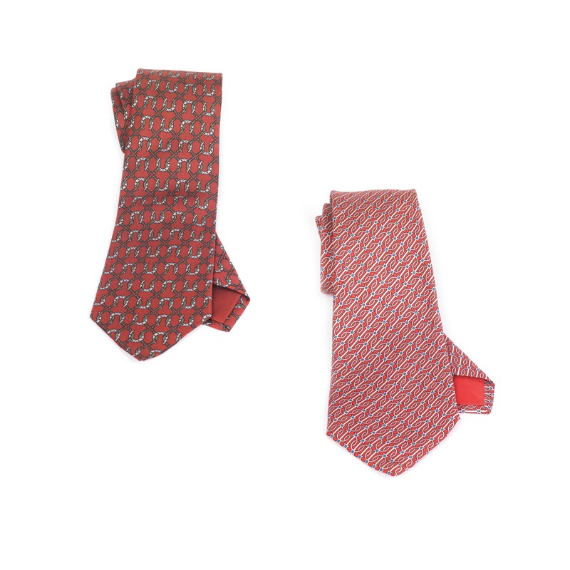 Entrambe in seta 100%. Due diverse rappresentazioni del tema caratteristico della Maison: le staffe e le cinghie dei cavalli. Entrambe sui toni del rosso e del bordeaux.