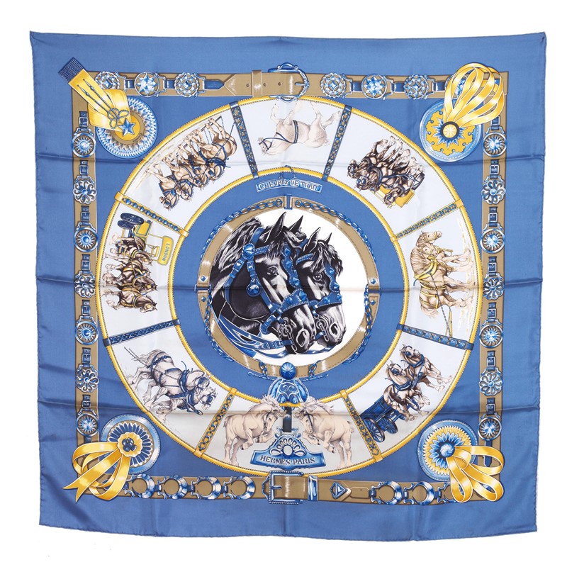 HERMES FOULARD "CHEVAUX DE TRAIT" Per chi ama il cavallo, qui protagonista nei momenti in cui tira carrozze di vario genere. Disegno presentato nel 1993 da Laurence Bourthoumieux, qui su seta 100% di un elegantissimo color celeste polvere. Corredato di scatola originale. Dim. cm 90x90