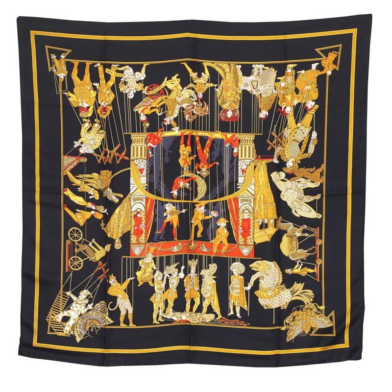 HERMES FOULARD "IL TEMPO DEI BURATTINI" Stampa unica nel suo genere, creato da Annie Faivre, raffigura una scena di burattini. In seta 100% su fondo nero con disegni nei toni dell'ocra e dettagli in rosso. Corredata di scatola originale. Dim. cm 90x90