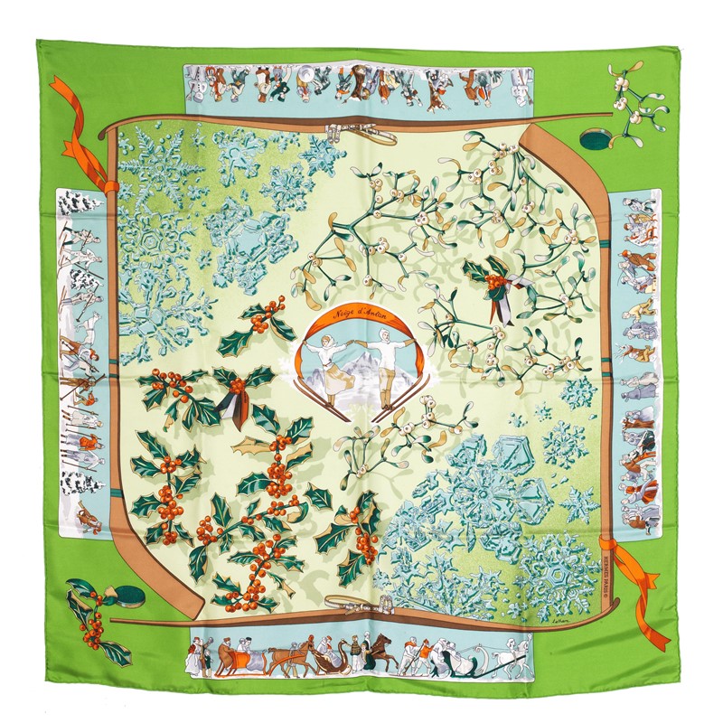 Perfetto per festeggiare il Natale, una base di seta 100% verde con immagini che riportano immediatamente la memoria alle festività natalizie, dal vischio ai fiocchi di neve ai personaggi sugli sci.