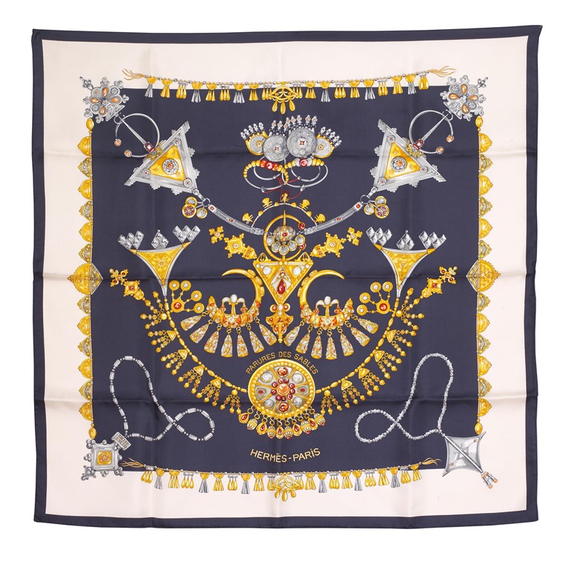 HERMES FOULARD "PARURE DES SABLES" Una seta 100% ancora croccante con fondo grigio e blu e disegni oro e crema fa da base alla stampa realizzata nel 1988 da Laurence Bourthoumieux. L'artista ha voluto rappresentare i gioielli che le donne perbene indossano come simboli di amore e di fecondità. Corredato di scatola originale. Dim. cm 90x90