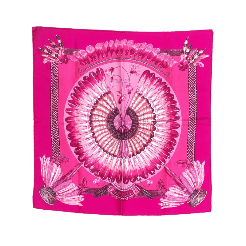 HERMES GAVROCHE "BRAZIL" In seta 100%, allegra stampa dalle sfumature del fucsia, creata da Laurence Bourthoumieux, che mostra come le piume siano parte integrante nella vita dei nativi del Brasile. La misura piccola è iconica e può essere usata al collo, al polso o intorno al manico di una borsa. Dim. cm 42x42