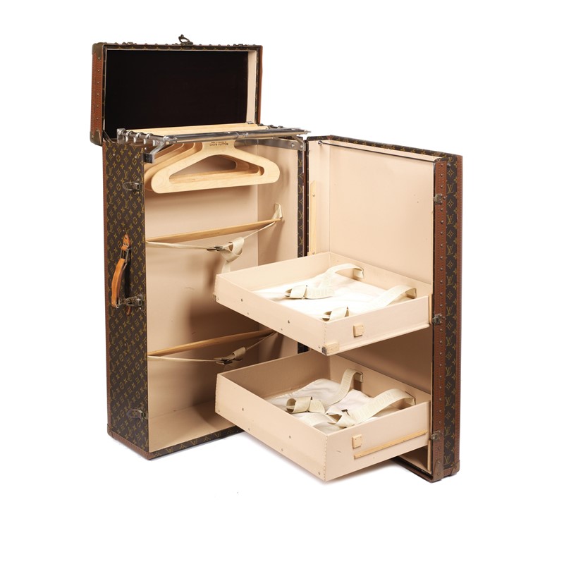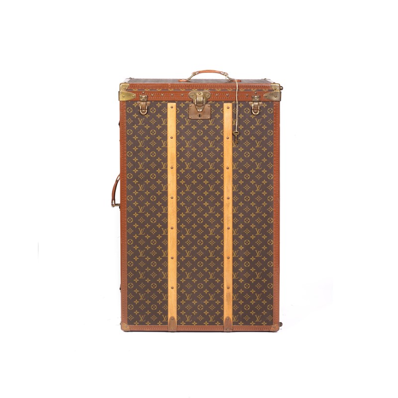LOUIS VUITTON BAULE GUARDAROBA LOZINE Splendido baule completamente attrezzato internamente in verticale con lato dotato di due cassetti perfettamente apribili e lato appenderia allungabile con stampelle originali e lacci ferma abiti. Originale struttura in legno con copertura in Monogram e dettagli in vacchetta con rinfrorzi in legno e chiusure in ottone. Fodera in tessuto. Corredato di chiave originale. Dim. chiuso 55x92x28 LOUIS VUITTON WARDROBE LOZINE TRUNK