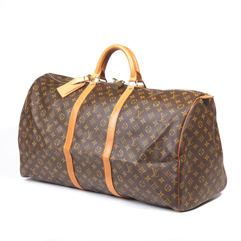 LOUIS VUITTON BORSA DA VIAGGIO BANDOULIERE 55 Borsa da viaggio classica perfetta, grazie al resistente tessuto Monogram, alle bretelle di rinforzo in vacchetta e al manico in pelle di toro; utilissima la tracolla regolabile per portarla a spalla. Chiusura con zip in ottone color oro come gli altri dettagli metallici. Corredata di chiavi originali. Dim. cm 55x28x25