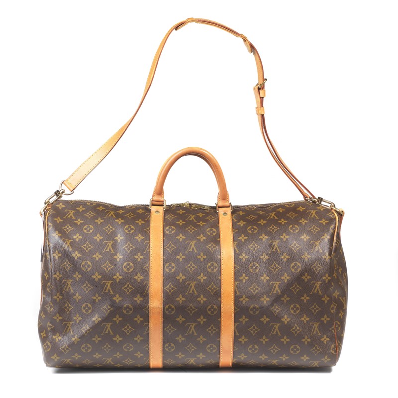 LOUIS VUITTON BORSA DA VIAGGIO BANDOULIERE 55 Borsa da viaggio classica perfetta, grazie al resistente tessuto Monogram, alle bretelle di rinforzo in vacchetta e al manico in pelle Toron; utilissima la tracolla regolabile per portarla a spalla: Chiusa con zip in ottone color oro come gli altri dettagli metallici. Dim. cm 55x30x25