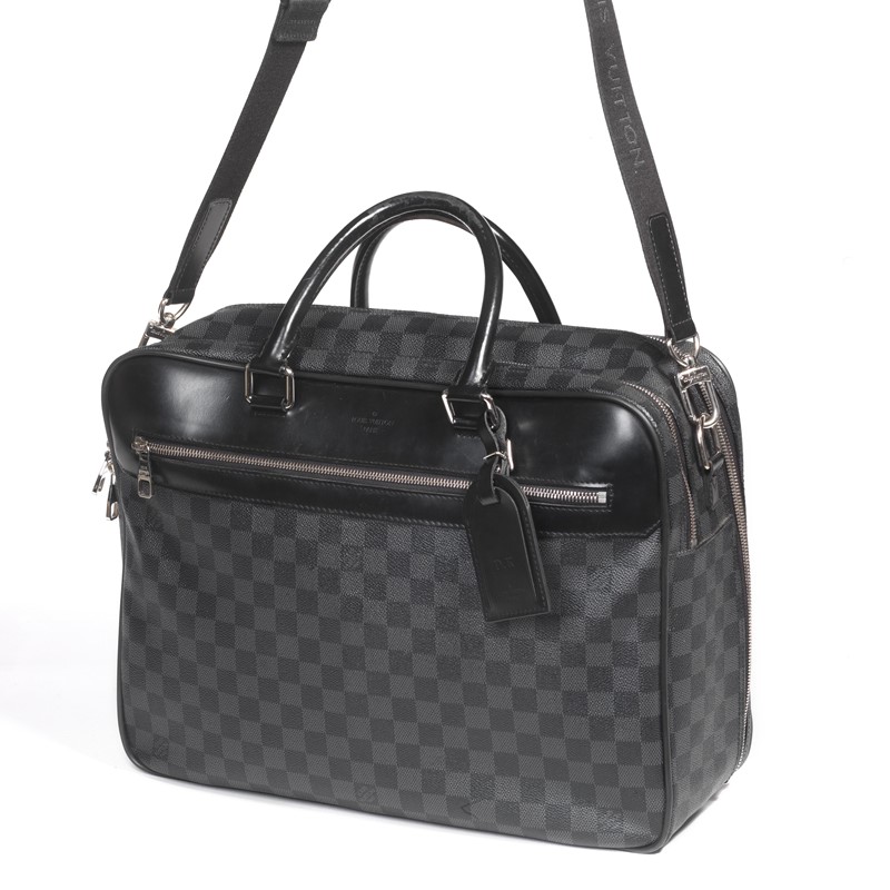 In Damier grafite e nero, una borsa overnight con rifiniture in pelle nera e metalleria in ottone color argento lucido. Corredata di tracolla e portaindirizzi originali.