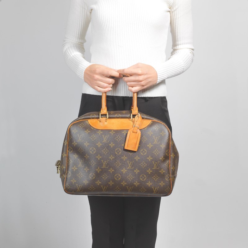 LOUIS VUITTON BORSA DEAUVILLE Con doppio manico e corpo borsa dalla forma inimitabile, in Monogram con rifiniture in vacchetta; tasca applicata sul davanti, cerniera in ottone con logo; fodera interna con tasche aperte. Corredata di porta indirizzi e chiavi originali. Dim. cm 35x26x14