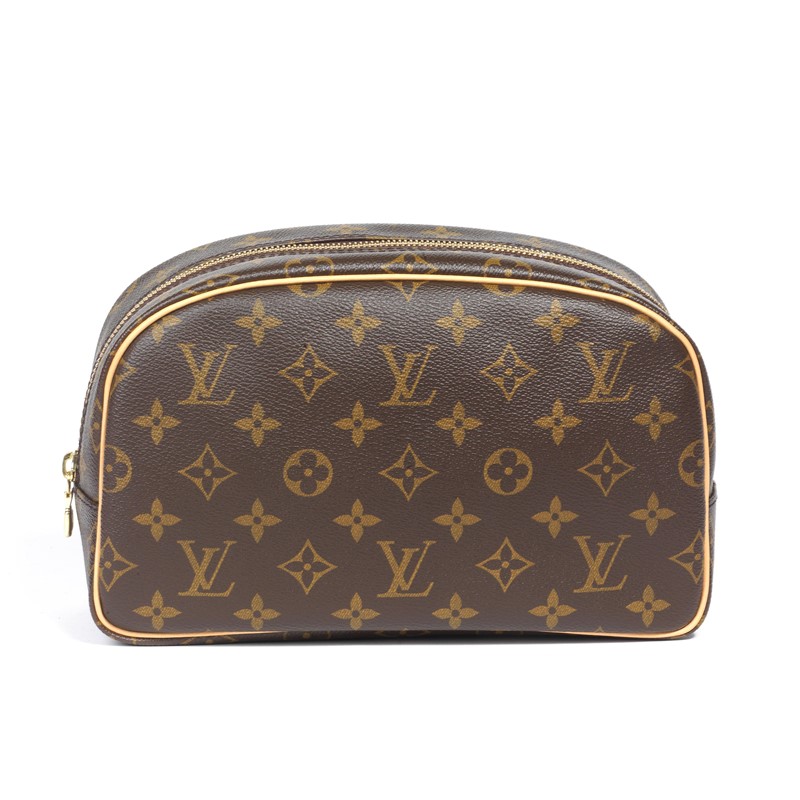 Modello squadrato, ottimo per contenere anche bottigliette, con interno lavabile ed esterno in Monogram profilato in vacchetta. Corredato di dust bag originale.