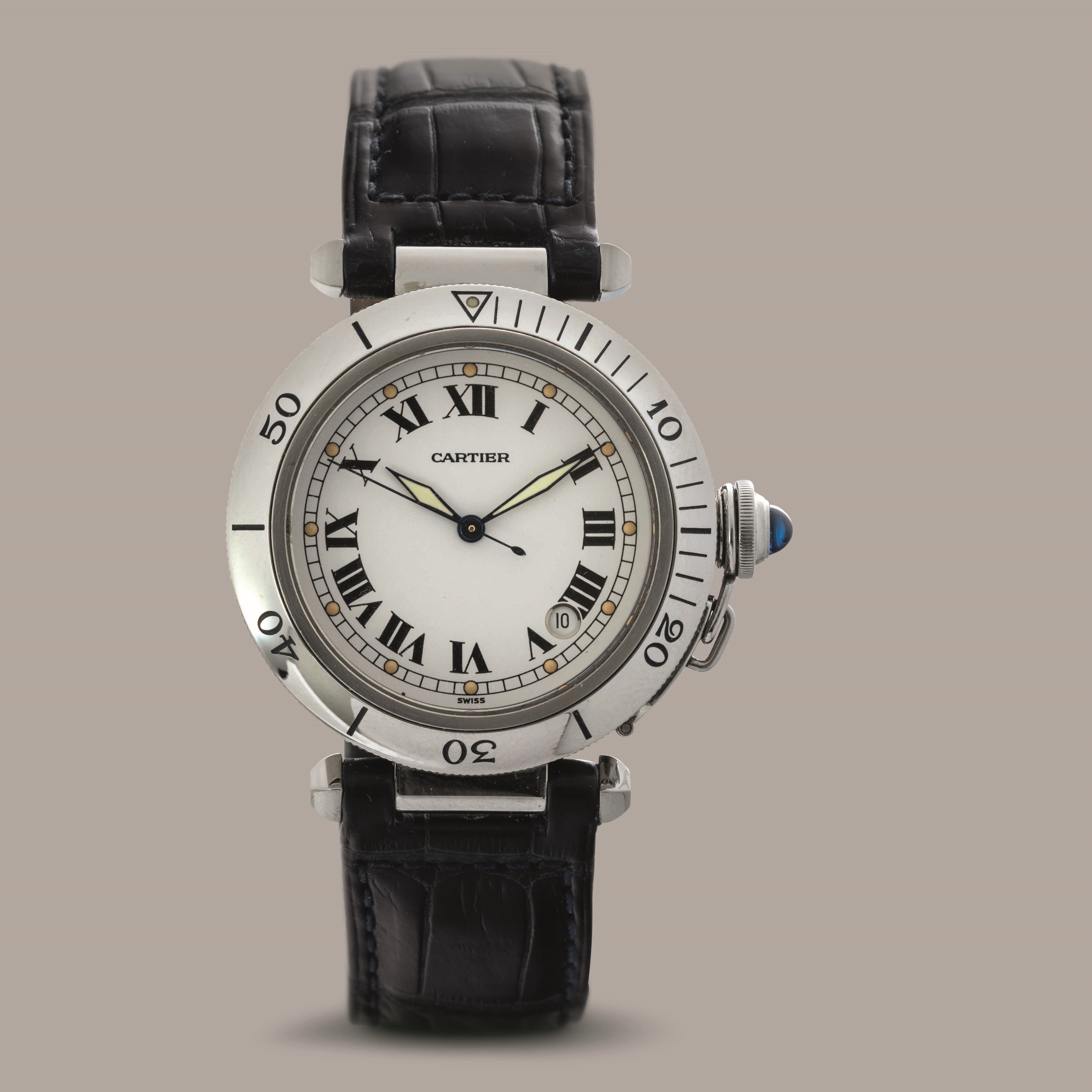 CARTIER - Pasha in acciaio, quadrante bianco numeri Romani con datario, movimento [..]