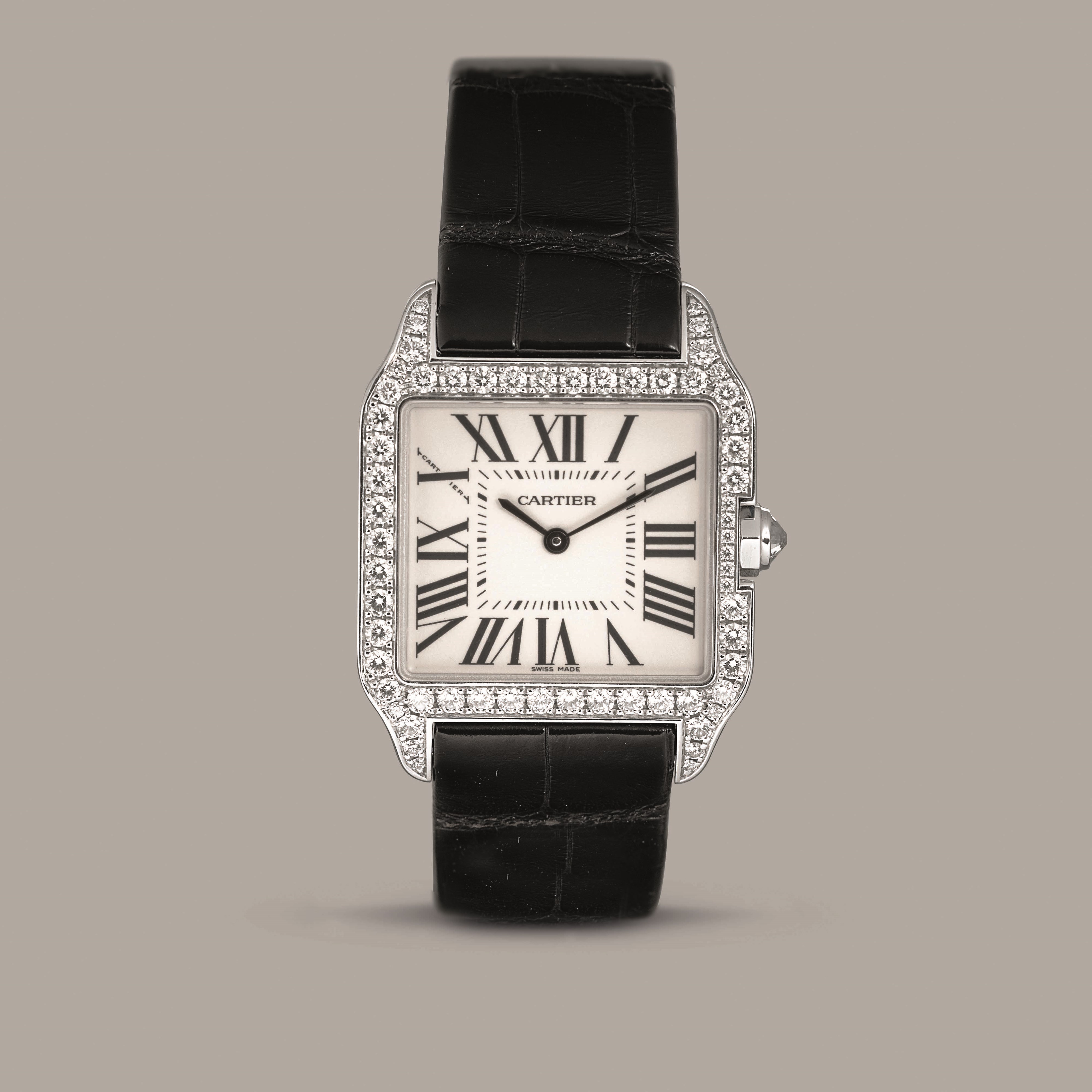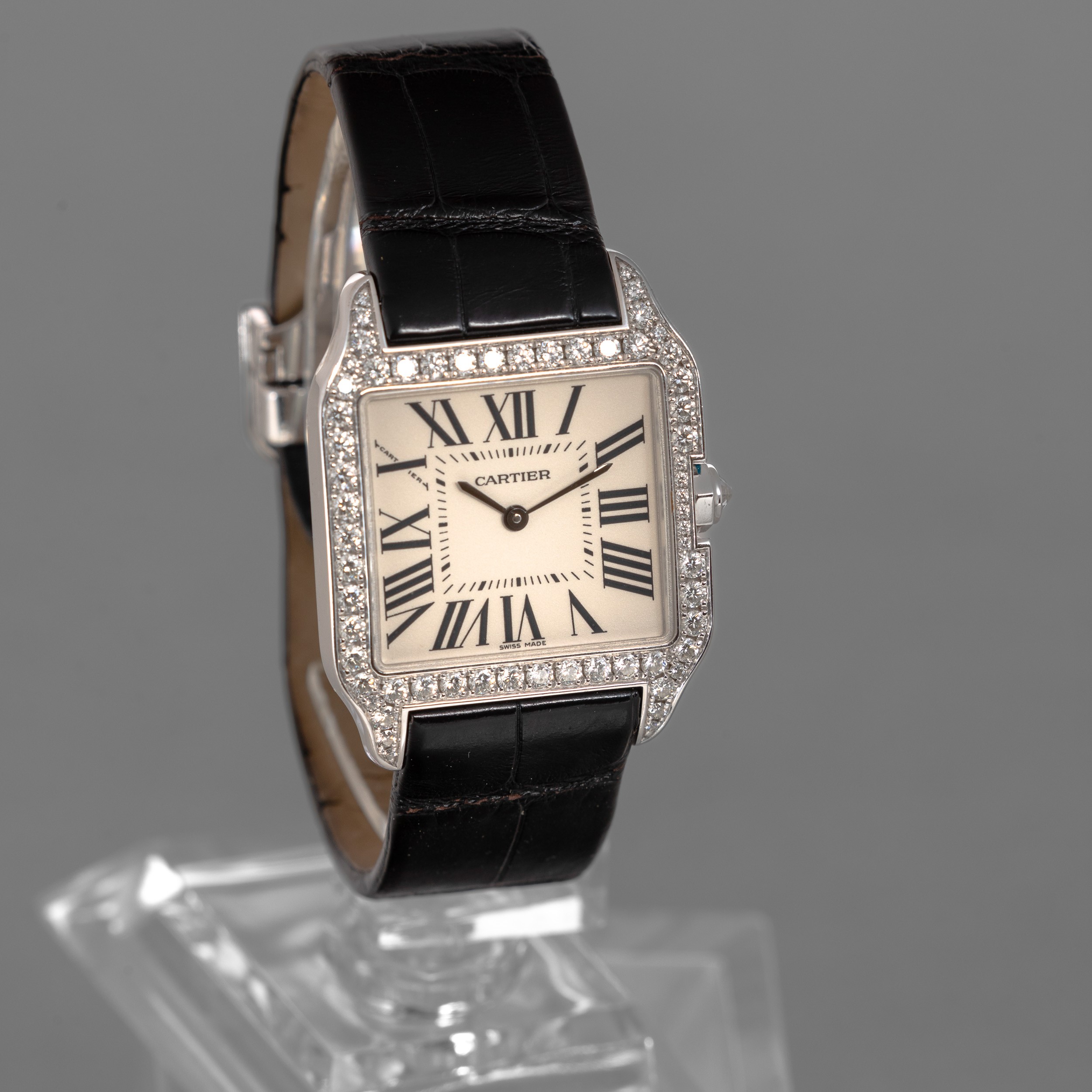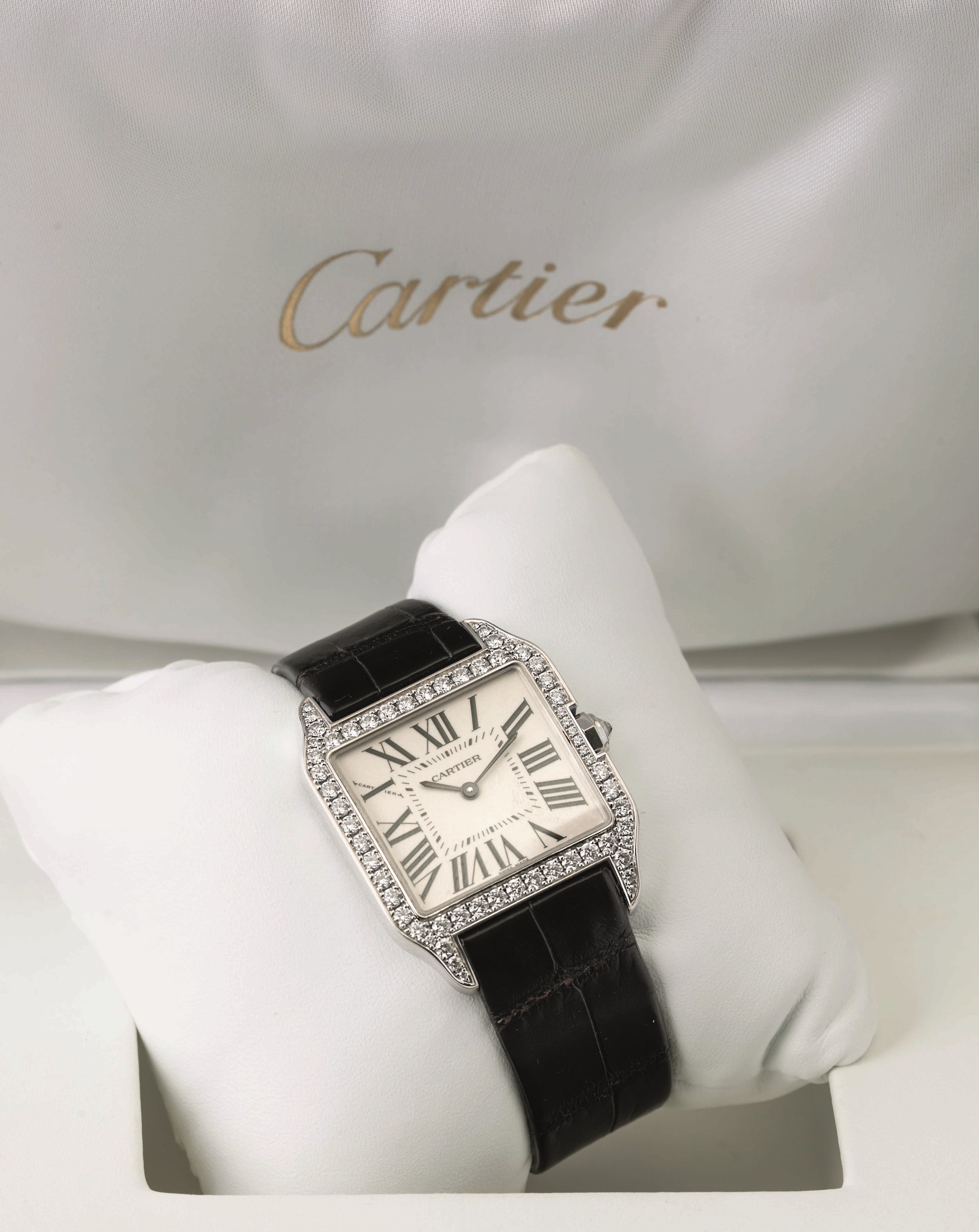CARTIER - Santos Dumont in oro bianco 18k e diamanti, quadrante argentè numeri romani, [..]