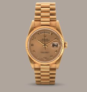 ROLEX - Daydate ref 18238 in oro giallo 18k, quadrante champagne con numeri Arabi [..]