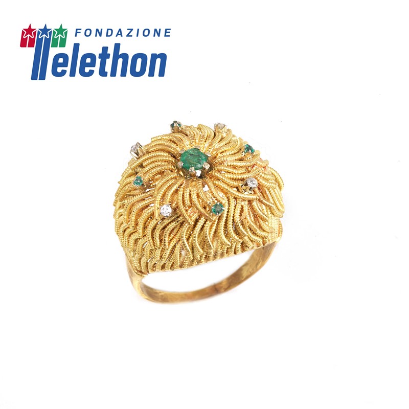 ANELLO A CUPOLA CON SMERALDI E DIAMANTI in oro giallo 18kt, lavorato a piccole cordicelle volte comporre un motivo floreale, impreziosito da smeraldi taglio rotondo e diamanti taglio huit huit per ct 0.20 circa, punzoni 750 e del fabbricante, mis. 58, gr. 13
