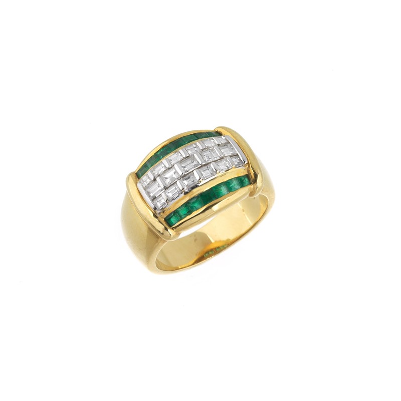 ANELLO A FASCIA CON SMERALDI E DIAMANTI in oro giallo e bianco 18kt, impreziosito da smeraldi taglio carré per ct 0.50 circa e diamanti taglio baguette per ct 1.20 circa, punzoni 750 e del fabbricante, mis. 54, gr. 11